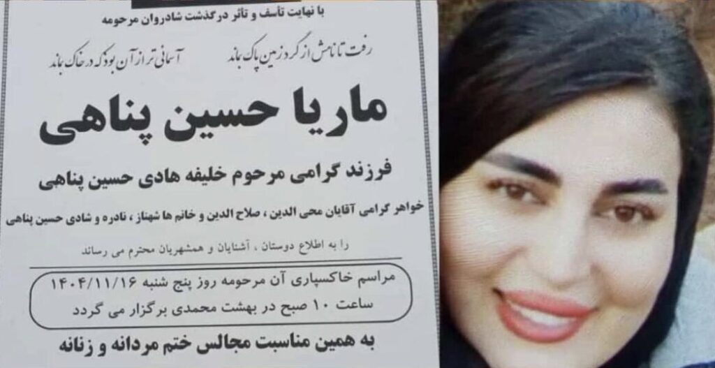 ماریا حوسێنپەناهی، هاووڵاتیی خەڵکی سنە، لە لایەن هاوژینەکەی خۆیەوە بە بەکارهێنانی چەکی سارد کوژرا. هۆکاری پاڵنەری بکوژ بۆ کوشتنی ماریا حوسێنپەناهی هەتا ئێستا ڕوون نییە ڕۆژی سێشەممە(٣ی فێبریوەری ٢٠٢٦)، ماریا حوسێنپەناهی تەمەن ٣٢ ساڵ و هاووڵاتیی خەڵکی سنە، لە لایەن هاوژینەکەیەوە بە ناوی شوان ناسری بە لێدانی چەقۆ کوژرا. ناوبراو بە تازەیی ژیانی هاوبەشی پێکهێنابوو و هاوژینەکەشی زۆر خۆش ویستووە.